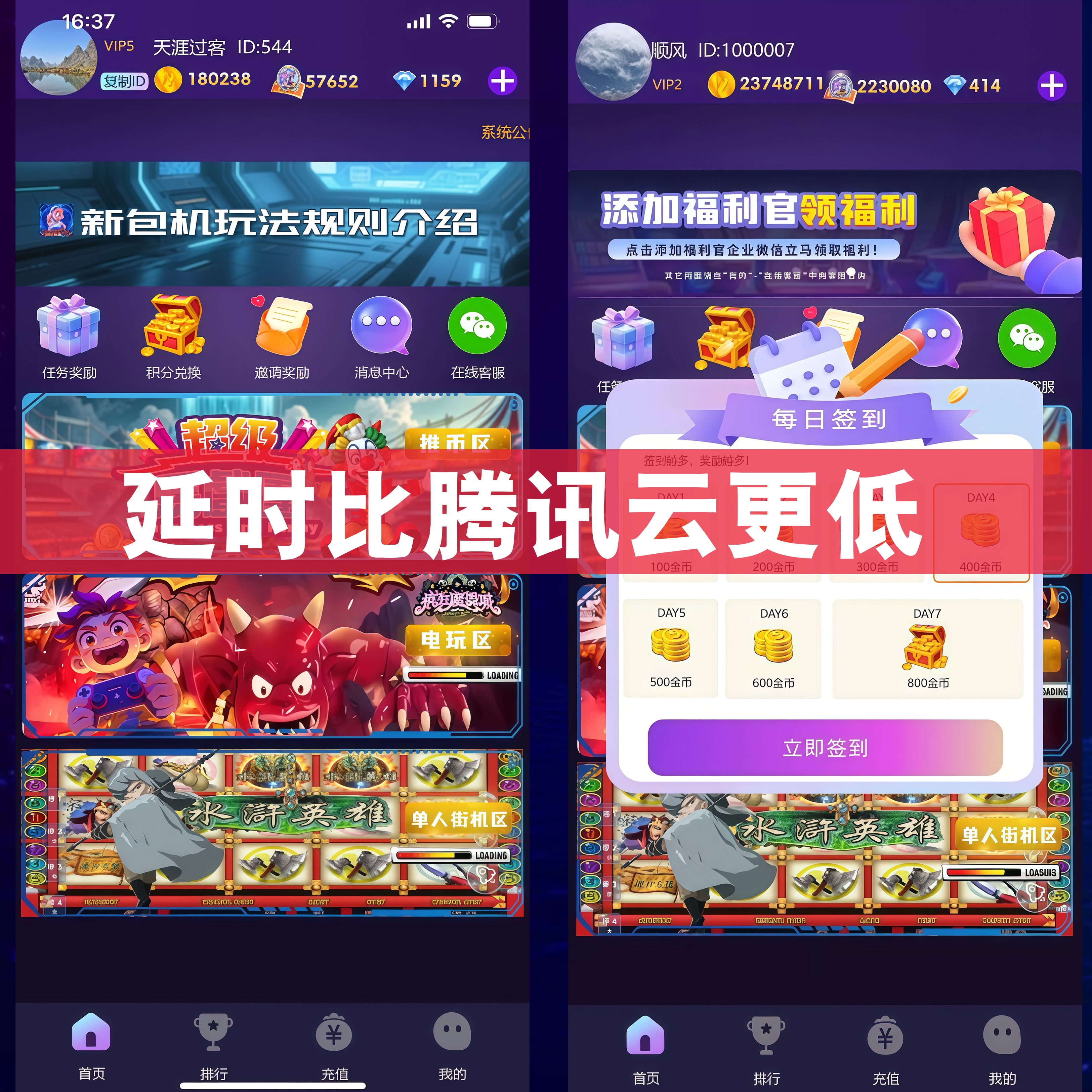 好游电玩推币机APP不使用腾讯云,无流量费,超低延时,长期稳定运行,已经接入市面上常见的机器设备 平台长期稳定运行,包含智能机器人系统,采用自主研发的流媒体平台和直播SDK,帮客户省去每个月需要支付的腾讯云服务器费用和流量费用,80-100台机器每个月可以节省3万左右的费用,而且延时比腾讯云更低!
